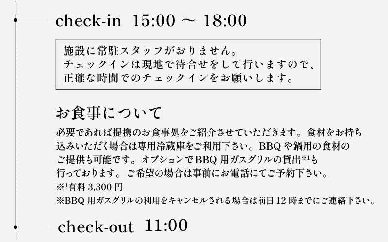 15:00 ~ 18:00 (施設に常駐スタッフがおりません。チェックインは現地で待合せをして行いますので、正確な時間でのチェックインをお願いします。)