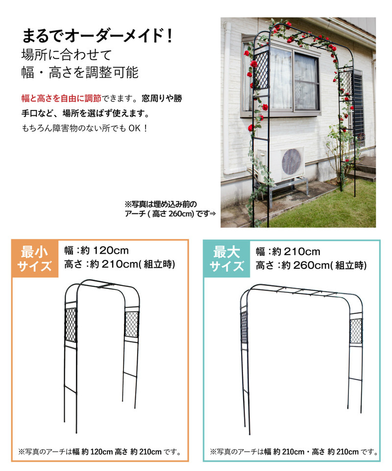 バラなどのつる性植物を育てるアーチとしてご使用いただけます。