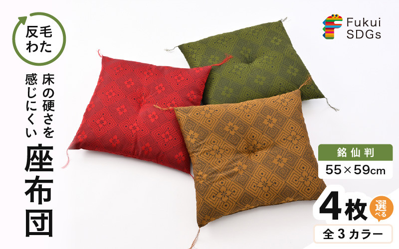 反毛わたを使用した高密度で弾力のある座布団をお届け! 床の硬さを感じにくい「反毛わた」座布団 武田菱(銘仙判55cm×59cm)4枚組【選べるカラー:グリーン/ゴールド/レッド】 [B-20410]