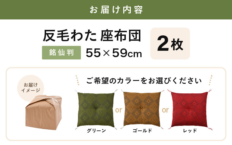 反毛わたを使用した高密度で弾力のある座布団をお届け! 床の硬さを感じにくい「反毛わた」座布団 武田菱(銘仙判55cm×59cm)2枚組【選べるカラー:グリーン/ゴールド/レッド】 [A-20420]