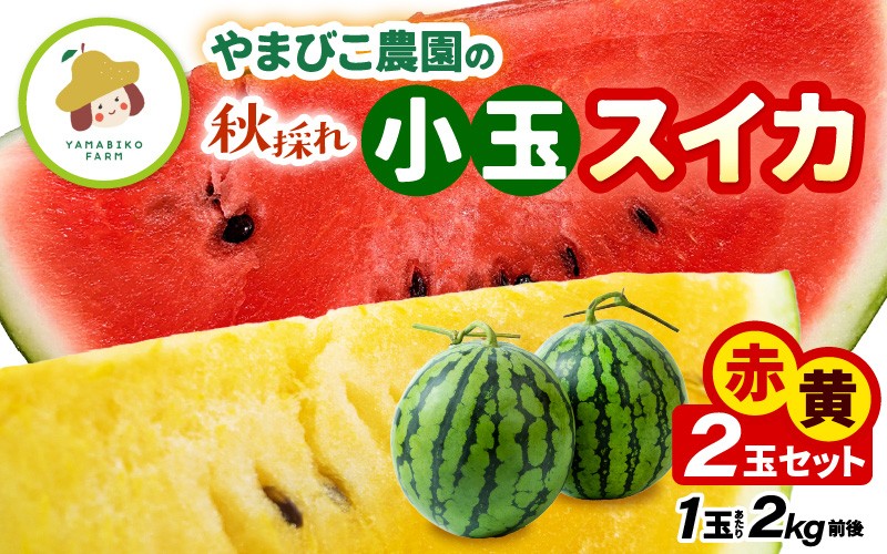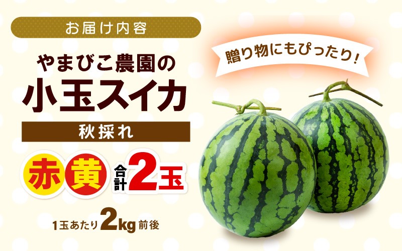潮風香る福井・坂井北部丘陵地で育った秋採れの小玉スイカ 【先行予約】やまびこ農園の秋の赤と黄の小玉スイカ 食べ比べセット 合計2玉入り (1玉当たり:2kg前後) 【2026年9月中旬以降順次発送予定】 【スイカ 西瓜 すいか 小玉 デザート 果物 くだもの 秋 ジューシー お取り寄せ グルメ 産地直送】 [A-21903]