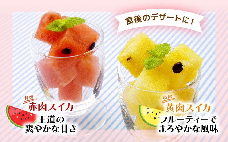 赤肉スイカは王道の爽やかな甘さ、黄肉スイカはフルーティーでまろやかな風味。