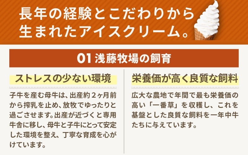 浅藤牧場は1958年の創業以来、「牛乳の持つ美味しさ」を追求し、変化の激しい酪農業界において、柔軟な経営で新たな挑戦を続けています。当牧場のアイスクリームは、この長年の経験とこだわりから生まれました。牛たちは健康でストレスの少ない環境で育っています。子牛を産むためのお母さん牛は、出産約2ヶ月前から搾乳を止め、放牧でゆったりと過ごさせます。出産が近づくと専用牛舎に移し、母牛と子牛にとって安定した環境を整え、丁寧な育成を心がけています。また、広大な農地で年間で最も栄養価の高い「一番草」を収穫し、これを基盤とした良質な飼料を一年中牛たちに与えています。