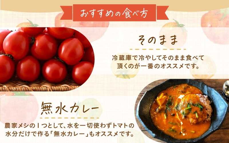 食べ方としては、冷蔵庫で冷やしてそのまま食べて頂くのが一番のオススメですが、農家メシの1つとして、水を一切使わずトマトの水分だけで作る「無水カレー」もオススメです。