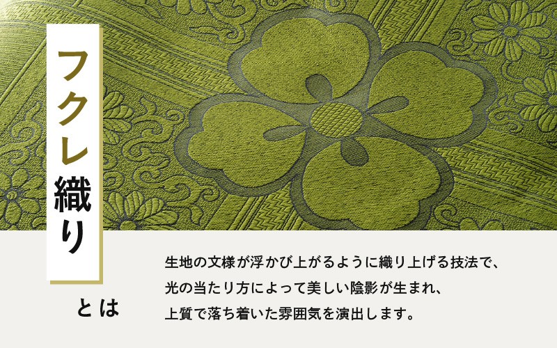 フクレ織りとは、生地に凹凸のある文様が浮かび上がるように織り上げる技法で、光の当たり方によって美しい陰影が生まれ、上質で落ち着いた雰囲気を演出します。