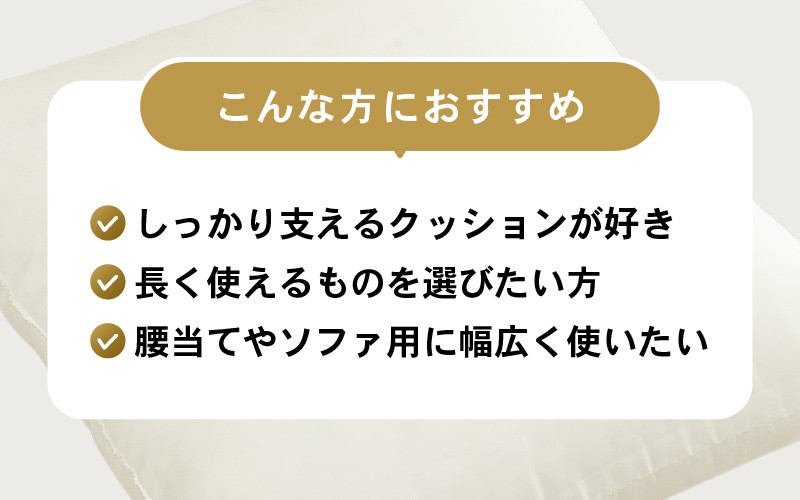 やわらかすぎず、しっかりと身体を支える弾力があるため、しっかりめのクッションがお好きな方にもおすすめです。腰当てや座布団、ソファクッションなど、さまざまなシーンで快適にお使いいただけます。