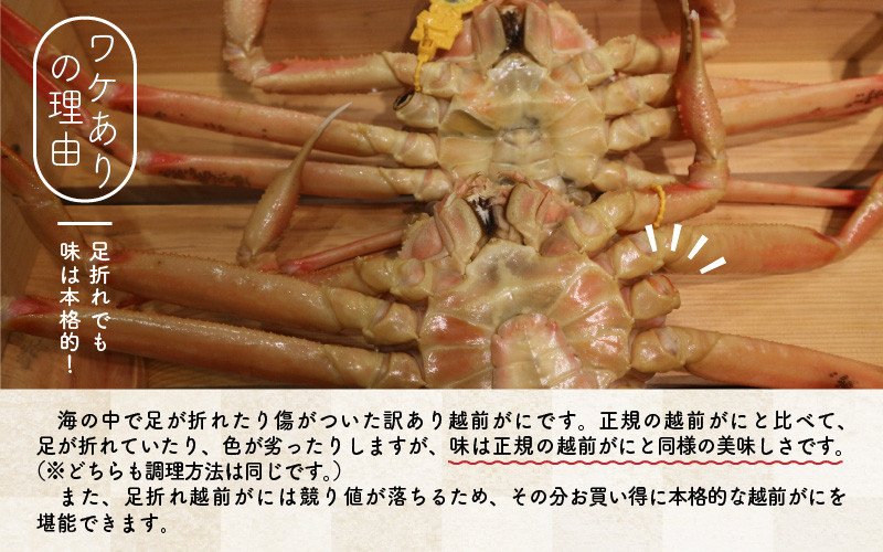 正規の越前がにと比べて、足が折れていたり、色が劣ったりします。