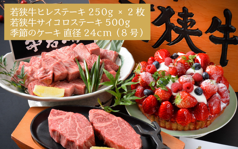 | 容量 | 若狭牛ヒレステーキ 250g × 2枚 若狭牛サイコロステーキ 500g 季節のケーキ 直径24cm(8号) |
