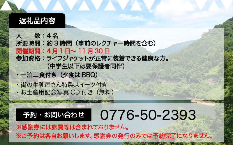 | 容量 | ●自然体験プログラムと一泊二食付き(夕食はBBQ)宿泊プラン 親子4名様 ・龍ヶ鼻ダムでのカヌー体験 催行人数:4名 カヌー催行時間:約3時間 ・お土産用記念写真CD付き ・街の牛乳屋さん特製スイーツ付き ※感謝券には旅費等は含まれておりません。 ※ご予約は各自お願いします。 ※感謝券の発行のみでは予約完了になりません。 体験内容の詳細は「ちくちくぼんぼん」にお問い合わせください。 [TEL] 0776-50-2393 |