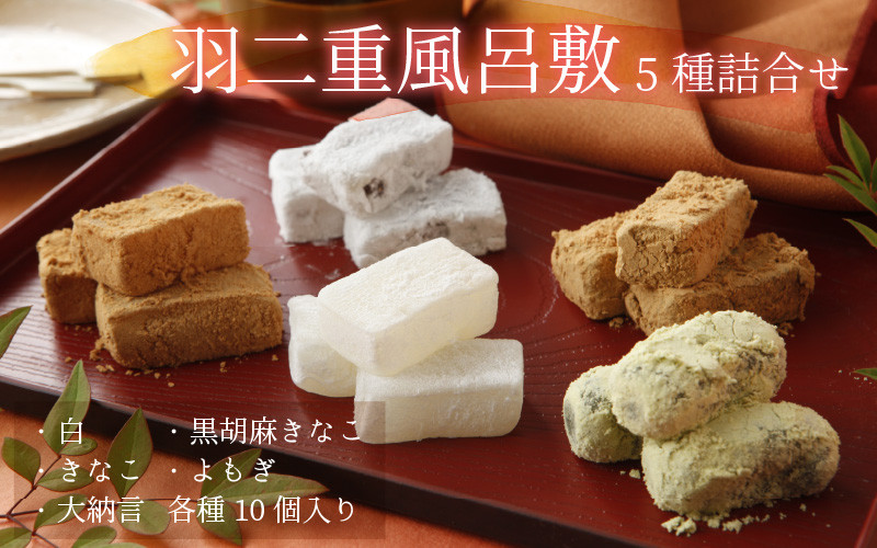福井県の代表銘菓である羽二重餅を、全部で5種類の詰合わせにしました 羽二重風呂敷5種詰合せ(各種10個入り)[A-011001] / はぶたえ 羽二重餅 はぶたえ餅 和菓子 餅 お餅 餅菓子 はぶたえもち 大納言 きなこ よもぎ 黒ゴマ 黒胡麻 お菓子 菓子 詰め合わせ 詰め合わせ セット 銘菓 食べ比べ 蓬餅 よもぎ餅 よもぎもち きな粉 きなこ きな粉餅