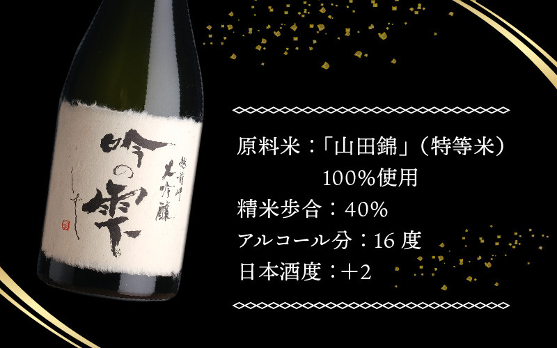 | 容量 | 大吟醸 「吟の雫」720ml 1本 ◆精米歩合 40% ◆アルコール分 16度 ◆日本酒度 +2 |