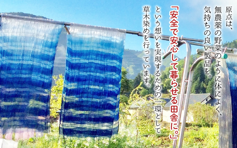 「安全で安心して暮らせる田舎に」という想いを実現するための一環として草木染めを行っています。染料を煮出したり染めたりするのには薪を使い、水も地下水を使用。染料は漢方薬に使われるものをはじめ、自宅の畑で育てたヨモギや藍、桜や栗、クルミなど、自然豊かな場所のものを使っています。