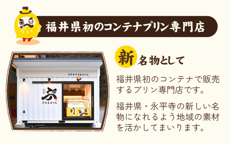 永平寺だるまぷりんは福井県初のコンテナで販売するプリン専門店です。