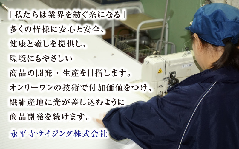 多くの皆様に安心と安全、健康と癒しを提供し、環境にもやさしい商品の開発・生産を目指します。オンリーワンの技術で付加価値をつけ、繊維産地に光が差し込むように商品開発を続けます。
