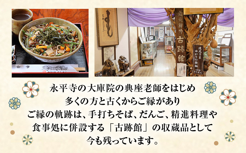 精進の精神も感じる大本山の麓にある手打ちそば処。大本山永平寺の麓にある手打ちそば屋。その土地柄から“精進”にこだわり、手打ちそばの他に精進料理やだんご、関連する土産物の販売も行う。食事処に併設する『古跡館』では、永平寺に関する貴重な書や仏像などを展示している。
