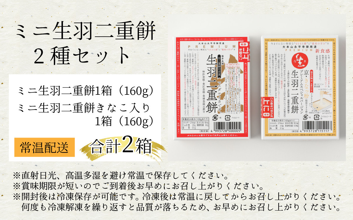 | 容量 | ミニ生羽二重餅:1箱(160g) ミニ生羽二重餅きなこ:1箱(160g) |