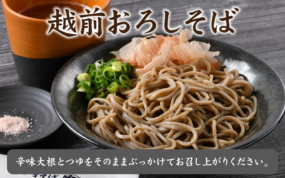 在来王国福井。中でも、永平寺町産のそばは、他の地域と比べ、実がしっかりと完熟してから刈り取りを行う為、芳醇な香りと甘みが特徴です。その永平寺町産のそば粉をまるごと石臼で挽きぐるみ粉にして、十割そばに仕上げました。そのまま一口お召し上がりいただくと、そば本来の甘みや香りが口いっぱいに広がります。 また、付属に越前そば流の薄口つゆと辛味大根が付いています。辛味大根とつゆをそのままぶっかけて越前おろしそばにして、お召し上がりください。