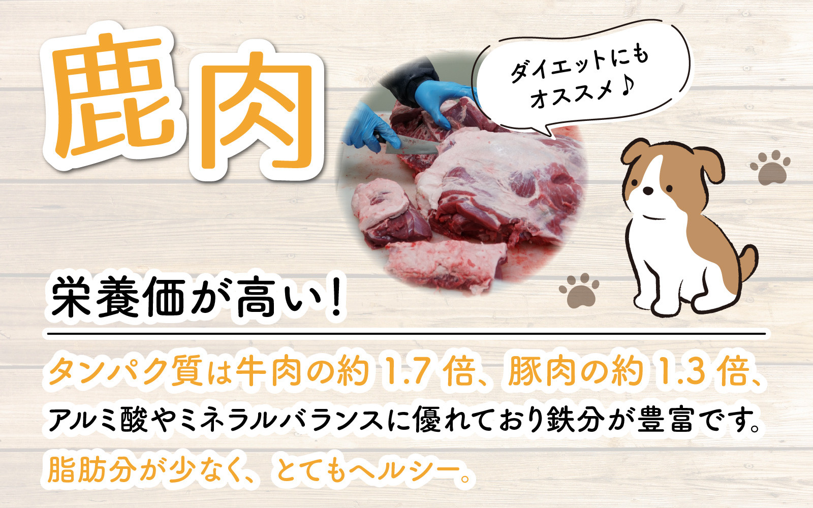 狩猟後1時間以内に自社設備で加工されるので新鮮で良質。カロリー控えめで栄養価が高くワンちゃんにぴったりです。