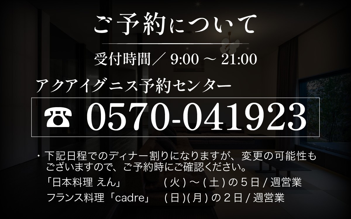 ・お電話のご予約はアクアイグニス予約センターまで(受付時間9:00~21:00) 0570-041923