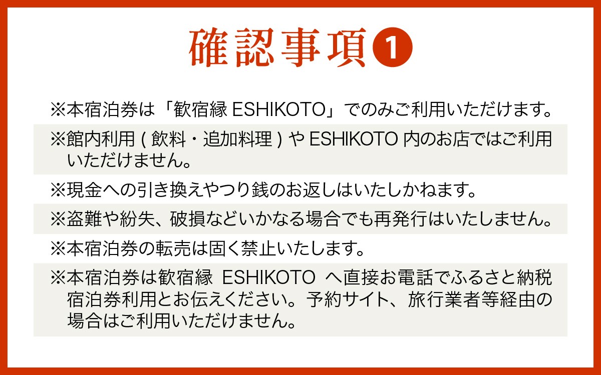 ・本宿泊券は歓宿縁ESHIKOTOへ直接お電話でふるさと納税宿泊券利用とお伝え下さい。予約サイト、旅行業者等経由の場合はご利用いただけません。