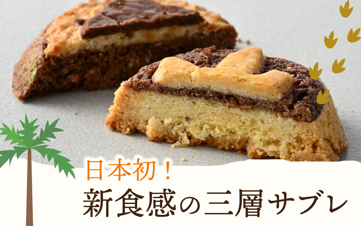 恐竜菓子店がお届けする地層をイメージした新食感の日本初の三層サブレ。下記4種類からいずれかの組み合わせで計3個 お選び頂けます。