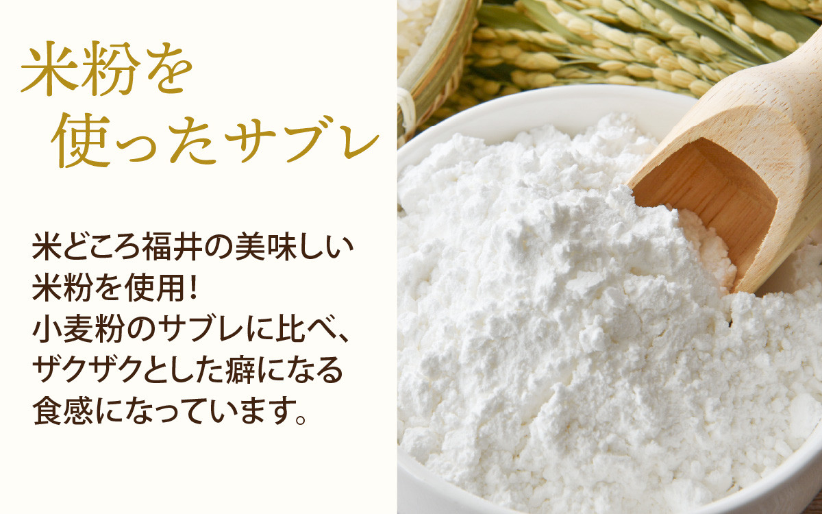 米どころ福井の美味しい米粉を使用したサブレです。小麦粉のサブレに比べ、ザクザクとしたくせになる食感に仕上がりました。また食塩には地元の越前海岸で作られた天然塩を使用しています。
