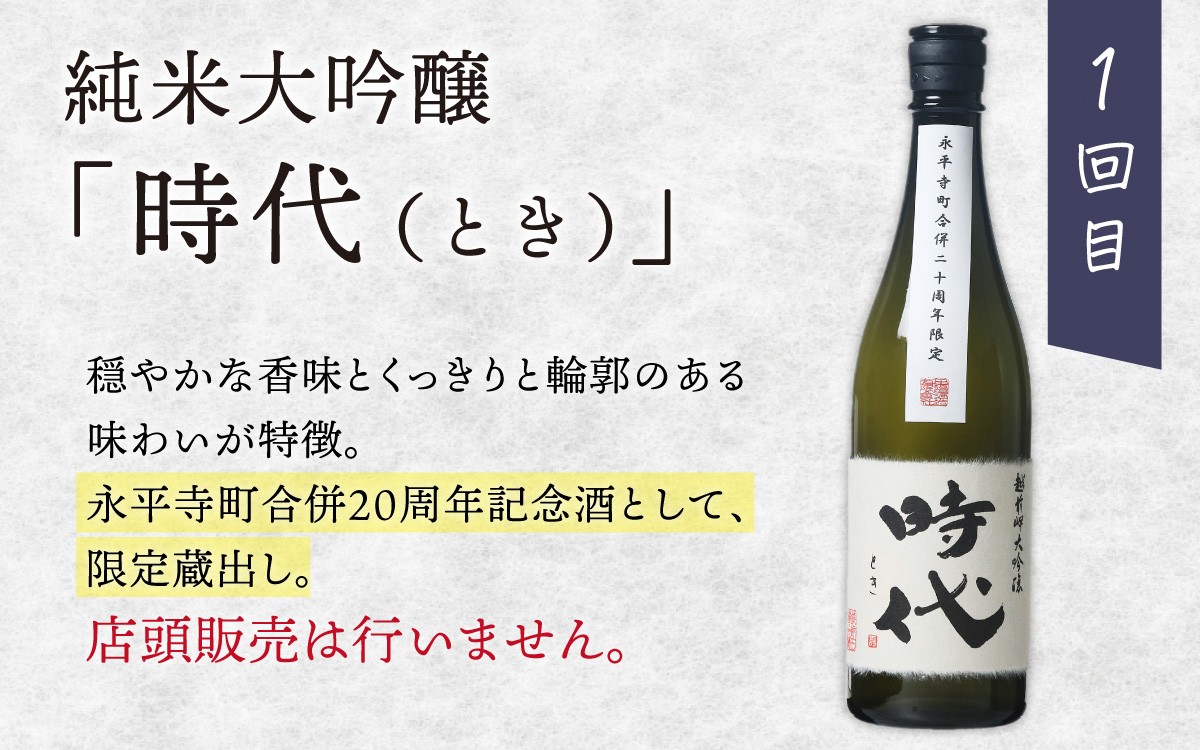 田辺酒造から、20周年記念酒も楽しめる定期便が登場! 【4か月連続お届け】田辺酒造 プレミアム定期便 / 酒 お酒 日本酒 地酒 晩酌 永平寺町 ギフト 贈答 バレンタイン ホワイトデー 福井 福井県地酒 20周年 金賞 北陸 純米大吟醸 時代 とき 吟の雫 さかほまれ 越前岬 [I-008001]