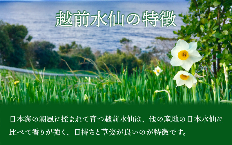 日本海の潮風に揉まれて育つ越前水仙は、他の産地の日本水仙に比べて、香りが強く、日持ちと草姿が良いのが特徴です。