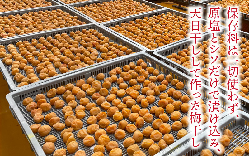 丹精込めて育てた完熟の梅を使用。保存料は一切使わず原塩とシソだけで漬け込み、天日干しして作られた梅干しです。