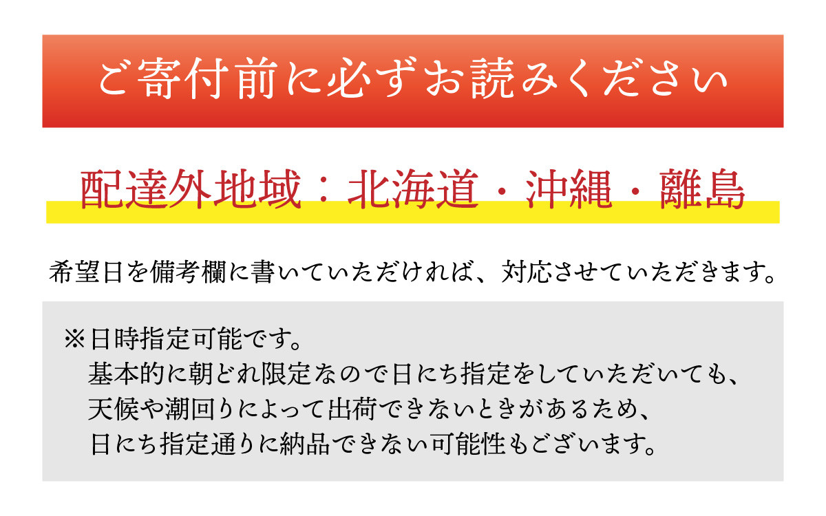 天候や潮回りによって出荷ができない時があるため、日にち指定通りに納品できない可能性もございます。