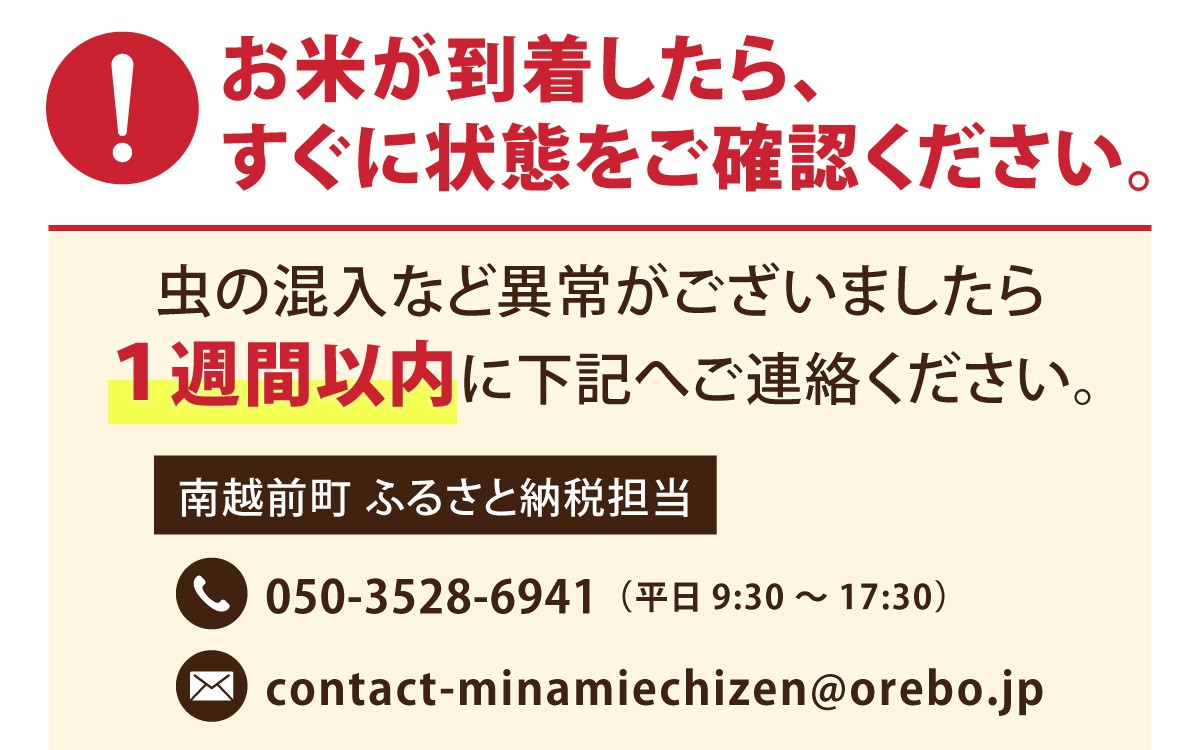 最後まで美味しく召し上がりいただくために、低温での保存、市販の米専用防虫剤を利用するなど、保存方法に注意をお願いいたします。