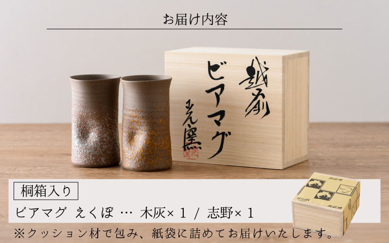 チョイスPayポイントと交換できる品 ビールを注いだ際のクリーミーな泡と、手にフィットする形が特徴です。桐箱入り。 [e25-a003] 【越前焼】光窯 ビアマグ えくぼ ペア 桐箱入り(木灰 × 1個 & 志野 × 1個)【福井県 マグカップ コップ ビール セット 伝統工芸品 陶器 陶磁器】