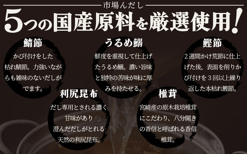 枯れ鯖節・うるめ鰯・本枯れ鰹節・利尻昆布・香信椎茸の5つの国産原料を厳選使用。