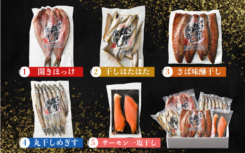 | 容量 | ■内容量 / 加工地 【1】開きほっけ × 1パック 尾数:2尾~4尾 【2】干しはたはたドレス300g × 1パック 尾数:13尾以上 【3】さば味醂干し × 1パック 枚数:4枚 【4】丸干しめぎす500g × 1パック 尾数:10尾~15尾 【5】サーモン一塩干し × 1パック 切数:2切れ 加工地:全て越前町 |