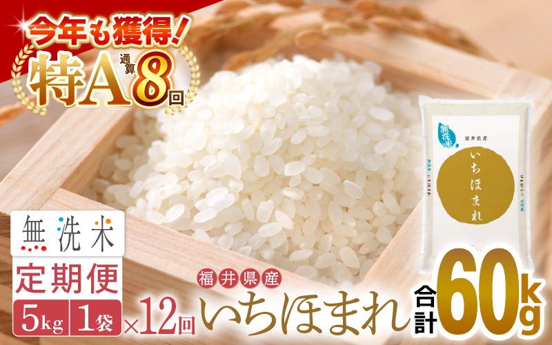 チョイスPayポイントと交換できる品 特A通算8回獲得!コシヒカリ生誕地からコシヒカリを超える新ブランド米が誕生! 特A通算8回!お米 令和7年産 無洗米 定期便 12回 いちほまれ 5kg × 12回(計60kg)福井県産【米 コメ kome 12ヶ月連続 計60キロ 精米 白米 便利 時短】 [e27-n007]