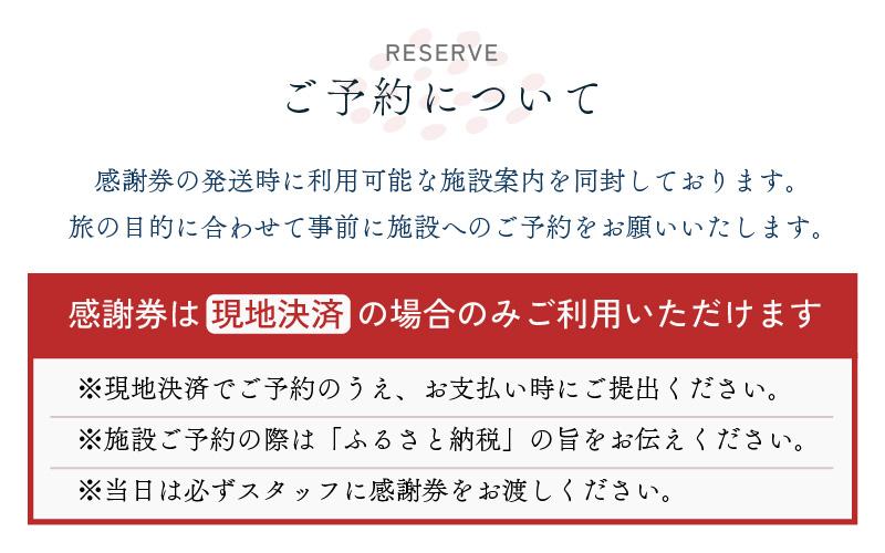 宿泊や飲食、買い物や施設入館などで幅広くご利用いただける感謝券です。