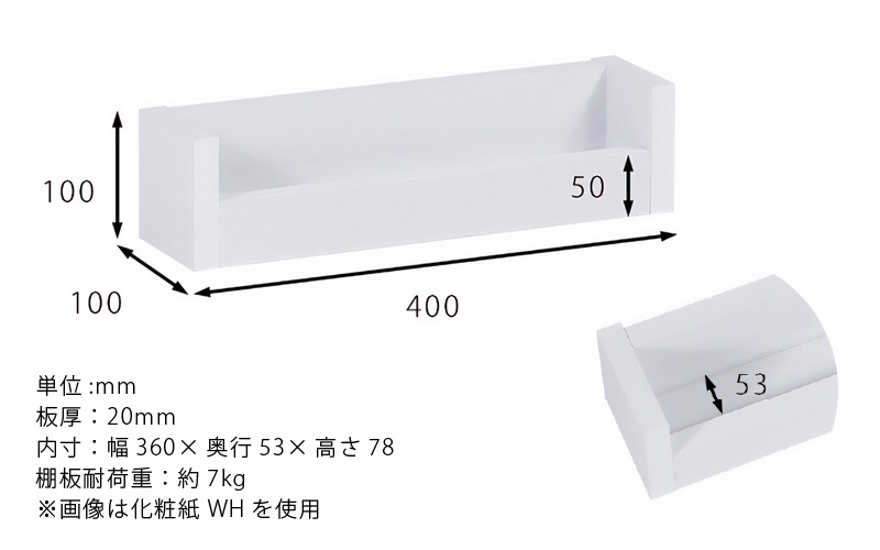 | 容量 | ■内容量 / 製造地 / 製造者 ウォールラック SPS WallRack 幅40cm アイカメラミン(完成品) 【カラー】 nail(ホワイト) 【サイズ】 幅約400 × 奥行100 × 高さ100mm 【内寸】 幅約360 × 奥行53 × 高さ78mm 【その他】 棚板耐荷重:約7kg 壁掛け用フック2個付属 製造地:越前町 製造者:株式会社arne |