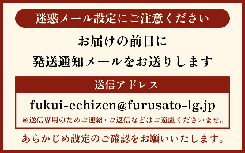 | 申込期日 | 2026年1月14日23時59分まで ※越前町内への返礼品発送は対応しておりません。 ※新鮮なお品をお届けするため、北海道、青森県、佐賀県、長崎県、熊本県、大分県、宮崎県、鹿児島県、沖縄県、及び一部離島への配送はできません。 |