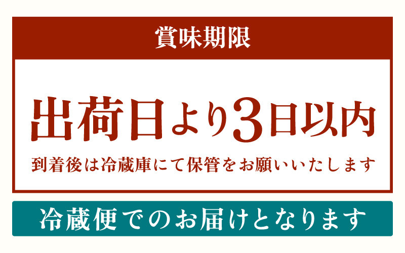 | 消費期限 | ■賞味期限等 出荷日より3日(冷蔵保存時) ※お礼品到着後は冷蔵庫2~5℃にて保存し、できるだけ早めにお召し上がりください。 |