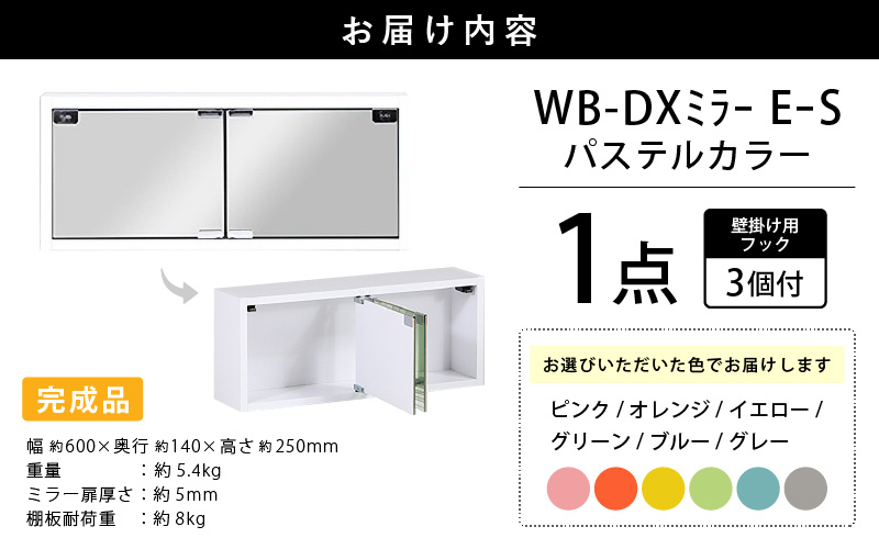 | 容量 | ■内容量 / 製造地 / 製造者 WB-DXミラーE-S aino パステルカラー(完成品) 【カラー】 ピンク/オレンジ/イエロー/グリーン/ブルー/グレー ※お選びいただいた色でお届けします。 【サイズ(約mm)】 幅600 × 奥行140 × 高さ250 【ミラー扉厚さ】 5mm 【その他】 重量:約5.4kg 棚板耐荷重:約8kg 日本製(完成品) 背面化粧仕上げ 壁掛け用フック3個付属 製造地:越前町 製造者:株式会社arne |