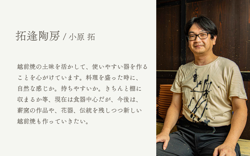 越前の土の特色を生かした、素朴で頑丈なつくりで、温かみのある土と灰釉の味わいを秘めた民芸的な美しさを持ち、その伝統は今日まで引き継がれ多くの人々に愛好されています。