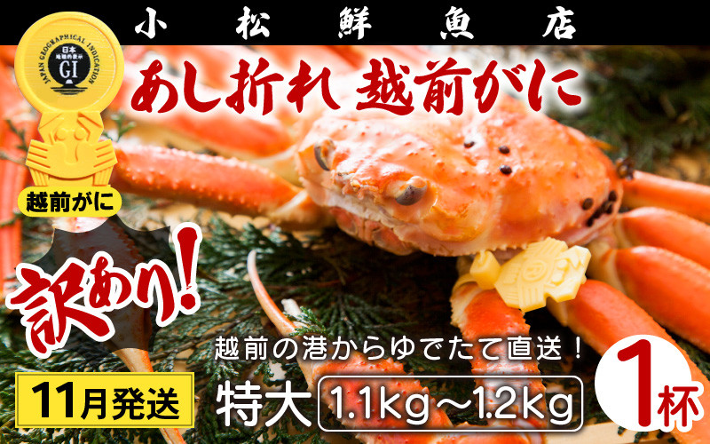 地域の生産者応援の品 チョイスPayポイントと交換できる品 越前がにの本場!越前町より直送!絶妙のゆで加減・塩加減でお届けいたします! 【訳あり】足折れ 越前がに 特大サイズ × 1杯(1.1~1.2kg)地元で喜ばれるゆで加減・塩加減で越前の港から直送!【雄 ズワイガニ ずわいがに 姿 ボイル 冷蔵 福井県】【11月発送分】希望日指定可 備考欄に希望日をご記入ください [e23-x014_11]