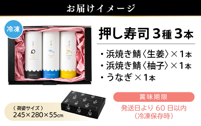 チョイスPayポイントと交換できる品 肉厚でジューシーな浜焼き鯖寿司2種とふっくら甘だれうなぎ寿司の3本セット 魚屋が作る 浜焼き鯖寿司 2種&うなぎ寿司 3本 セット!浜焼き鯖寿司(生姜)×1本 浜焼き鯖寿司(ゆず)×1本 うなぎ 寿司×1本【さば サバ 鯖 鰻 ウナギ 寿司 すし 焼き 魚 冷凍 レンジ グルメ 福井 土産】 [e04-a096]