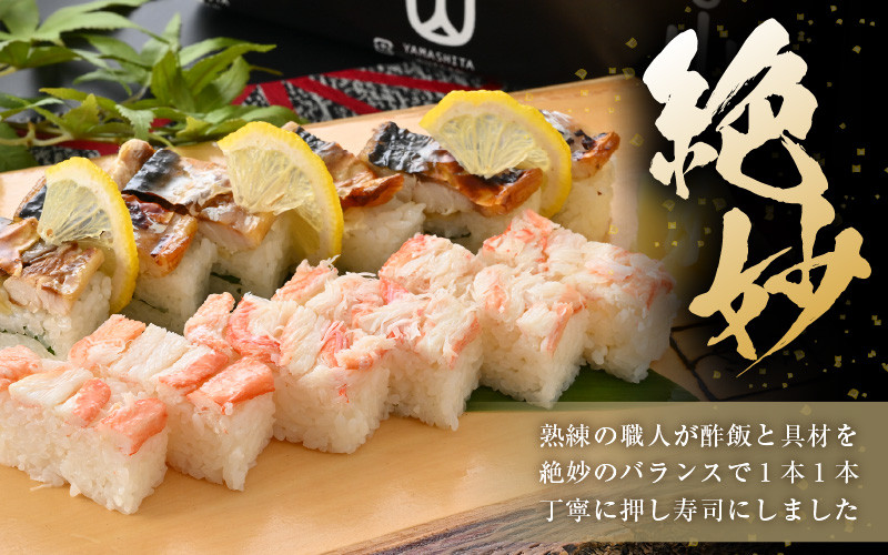 肉厚で脂がのったノルウェー産の鯖を香ばしく焼き上げ、熟練の職人が酢飯と具材を絶妙のバランスで1本1本丁寧に押し寿司にしました!