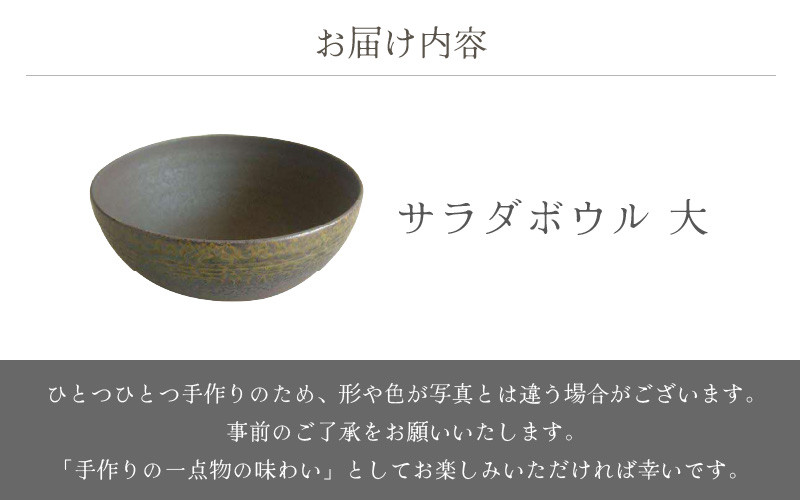 | 容量 | ■内容量 / 原産地 / 製造地 / 製造者 【越前焼】サラダボウル 大 【サイズ】径20.5cm × 高さ8.5cm 【対応機器】食洗機OK、電子レンジOK 原産地:越前町 製造地:越前市 製造者:宗山窯(宗倉 克幸) |