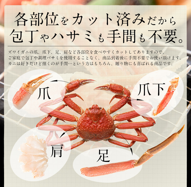 面倒な殻むき不要!お刺身としても食べられるカット済み生ずわい蟹!