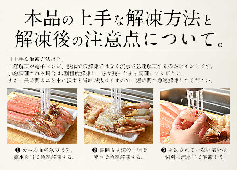当商品は、面倒な皮むきが必要ない様に、蟹を蟹足、肩肉、蟹爪、爪下など殻を剥いてあり、蟹足は片側だけ殻が剥いてあるハーフポーションとなります。