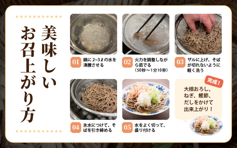 水をよく切り、そばの器に盛り、薬味をのせ、だしをかけて、なるべく早くお召し上がりください。だしは3倍に薄めてご使用ください。
