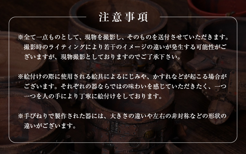 絵付けの際に使用される絵具によるにじみや、かすれなどが起こる場合がございます。それぞれの器ならではの味わいを感じていただきたく、一つ一つを人の手により丁寧に絵付けをしております。