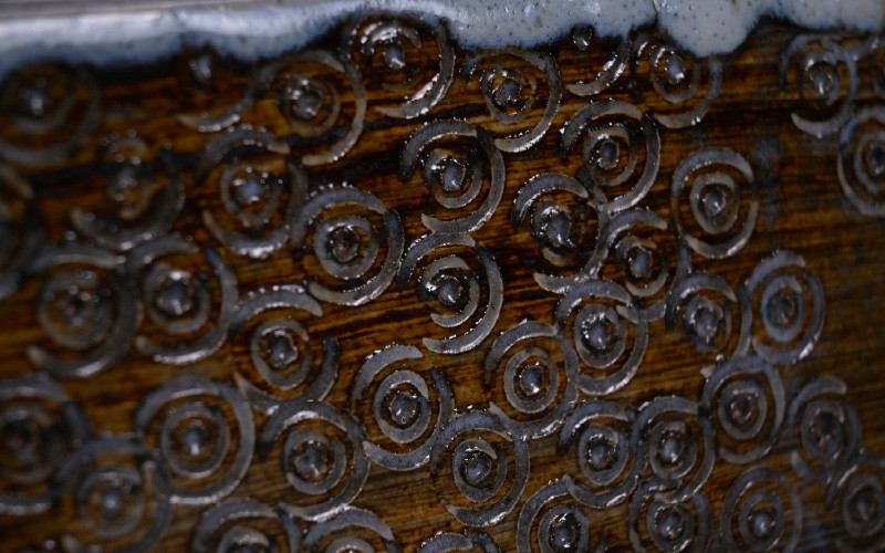 タタラ成形したものに白化粧し、その上に鉄を塗り、◎文に彫った器です